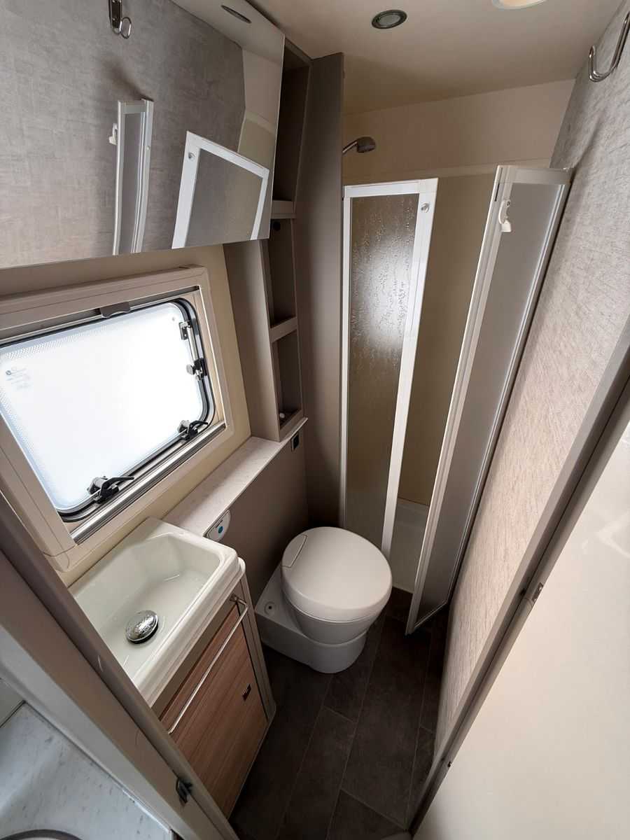 - Bad: Eine separate Duschkabine mit Acrylglastüren und eine drehbare Thetford-Kassettentoilette.