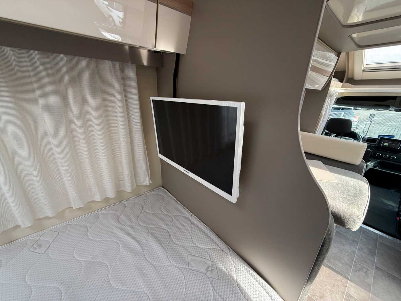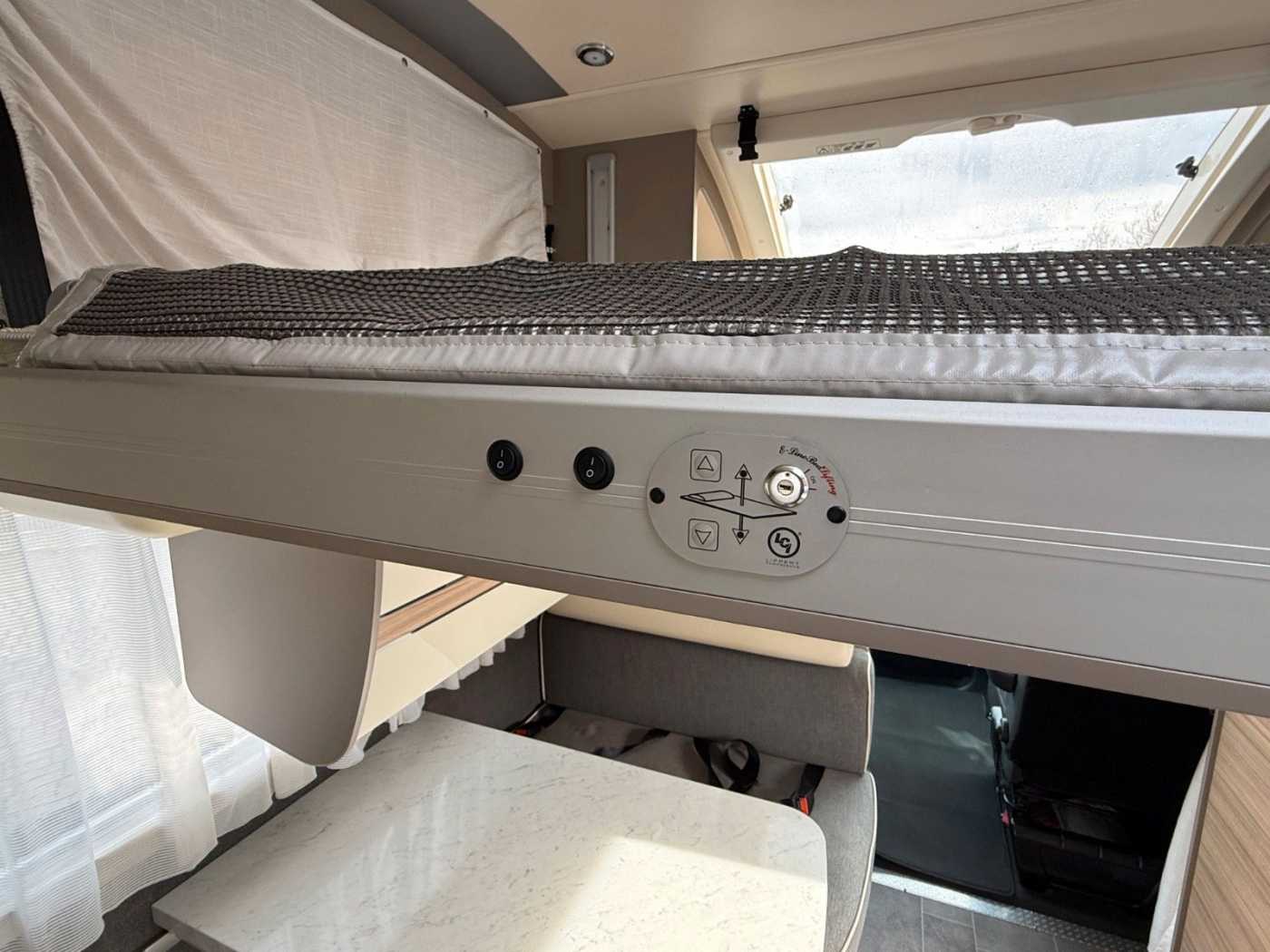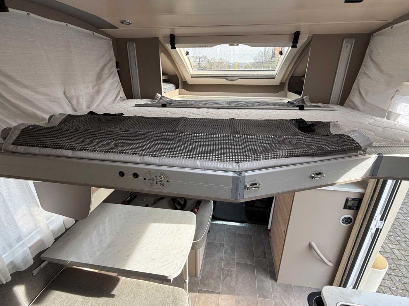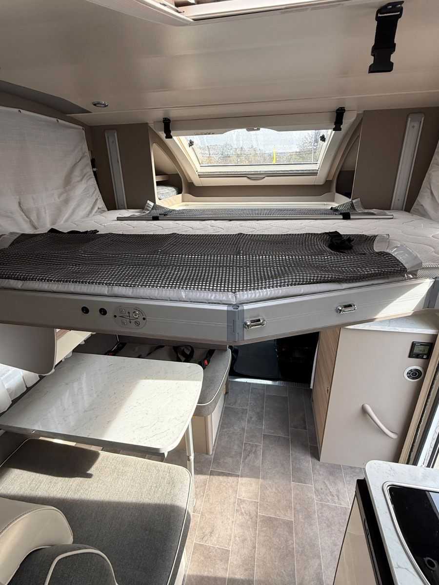 - Schlafplätze: Ein festes Doppelbett im Heck und ein elektrisches Hubbett für zwei Personen über der Dinette. Die Dinette kann oft zu zwei weiteren Schlafplätzen umgebaut werden, sodass insgesamt bis zu sechs Schlafplätze zur Verfügung stehen.